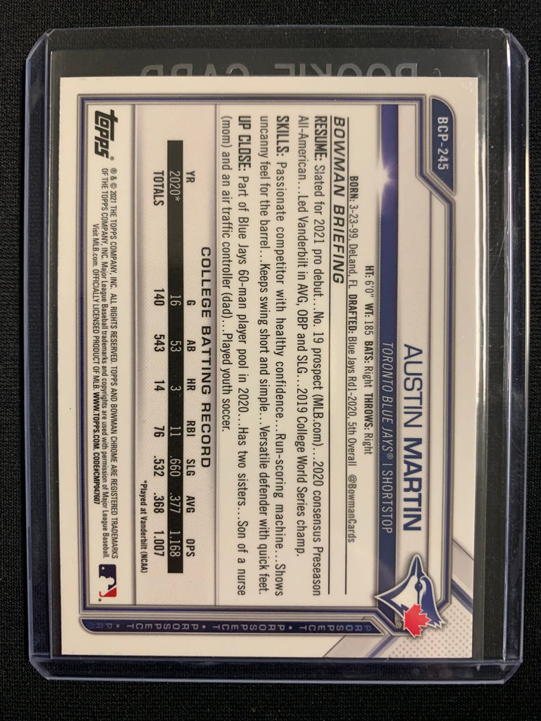 2021 BOWMAN CHROME BASEBALL #BCP-245 TORONTO BLUE JAYS - AUSTIN MARTIN BLACK & WHITE MINI DIAMOND PARALLEL PROSPECT ROOKIE CARD