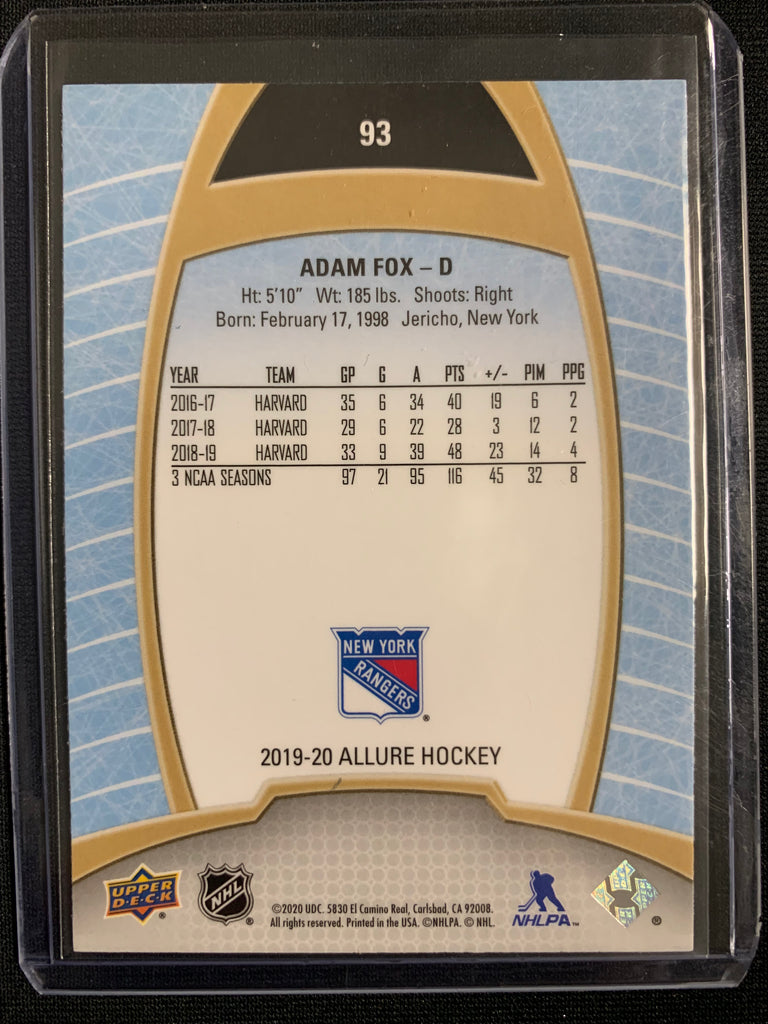 2019-20 UPPER DECK ALLURE HOCKEY #93 NEW YORK RANGERS - ADAM FOX BASE ROOKIE CARD