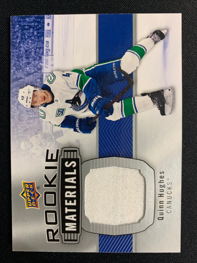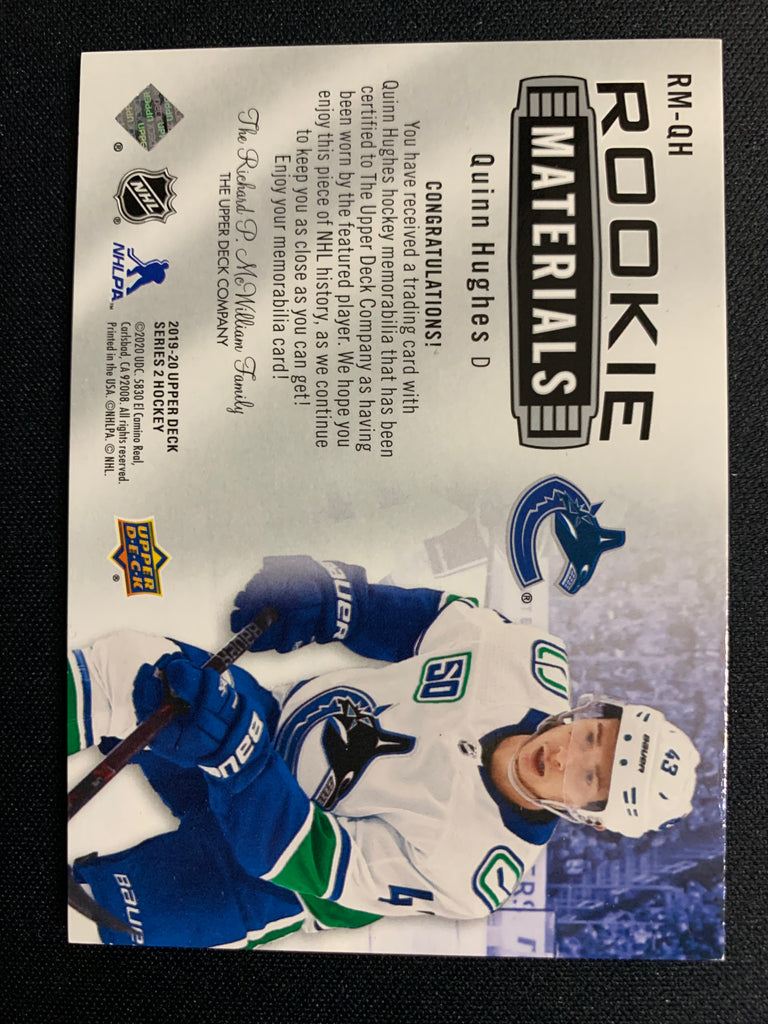 2019-20 UPPER DECK SERIES 2 HOCKEY #RM-QH VANCOUVER CANUCKS - QUINN HUGHES ROOKIE MATERIALS ROOKIE CARD