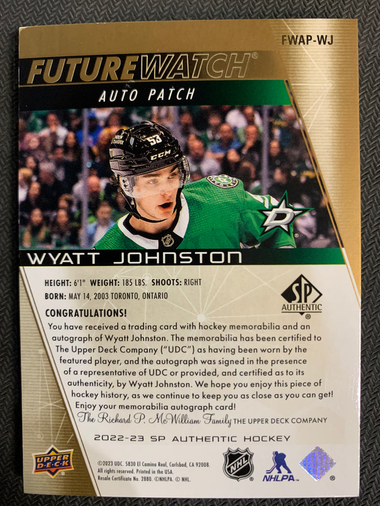2022-23 UD SP AUTHENTIC HOCKEY #FWAP-WJ DALLAS STARS  - WYATT JOHNSTON FUTURE WATCH AUTO PATCH #'D 067/100