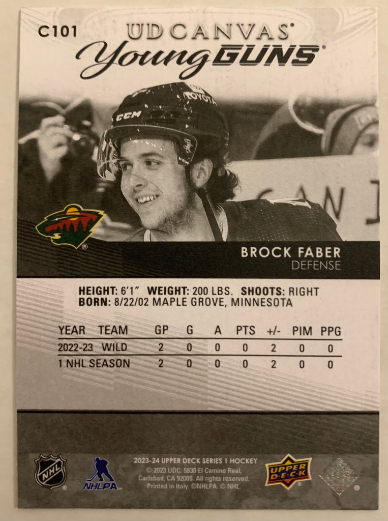 2023-24 UPPER DECK SERIES 1 HOCKEY #C101 MINNESOTA WILD - BROCK FABER BLACK CANVAS YOUNG GUNS ROOKIE